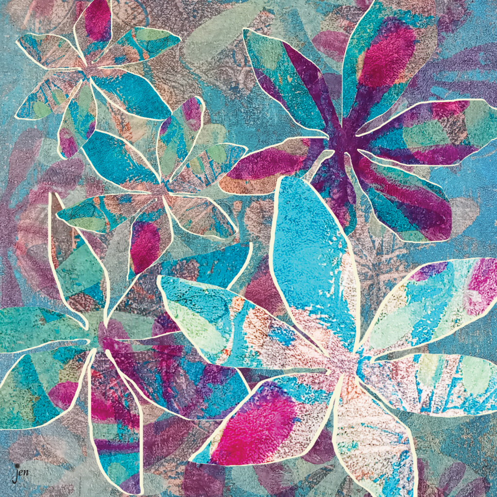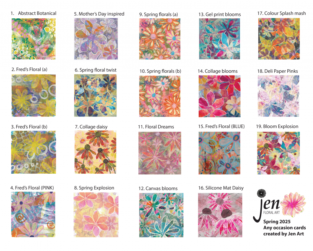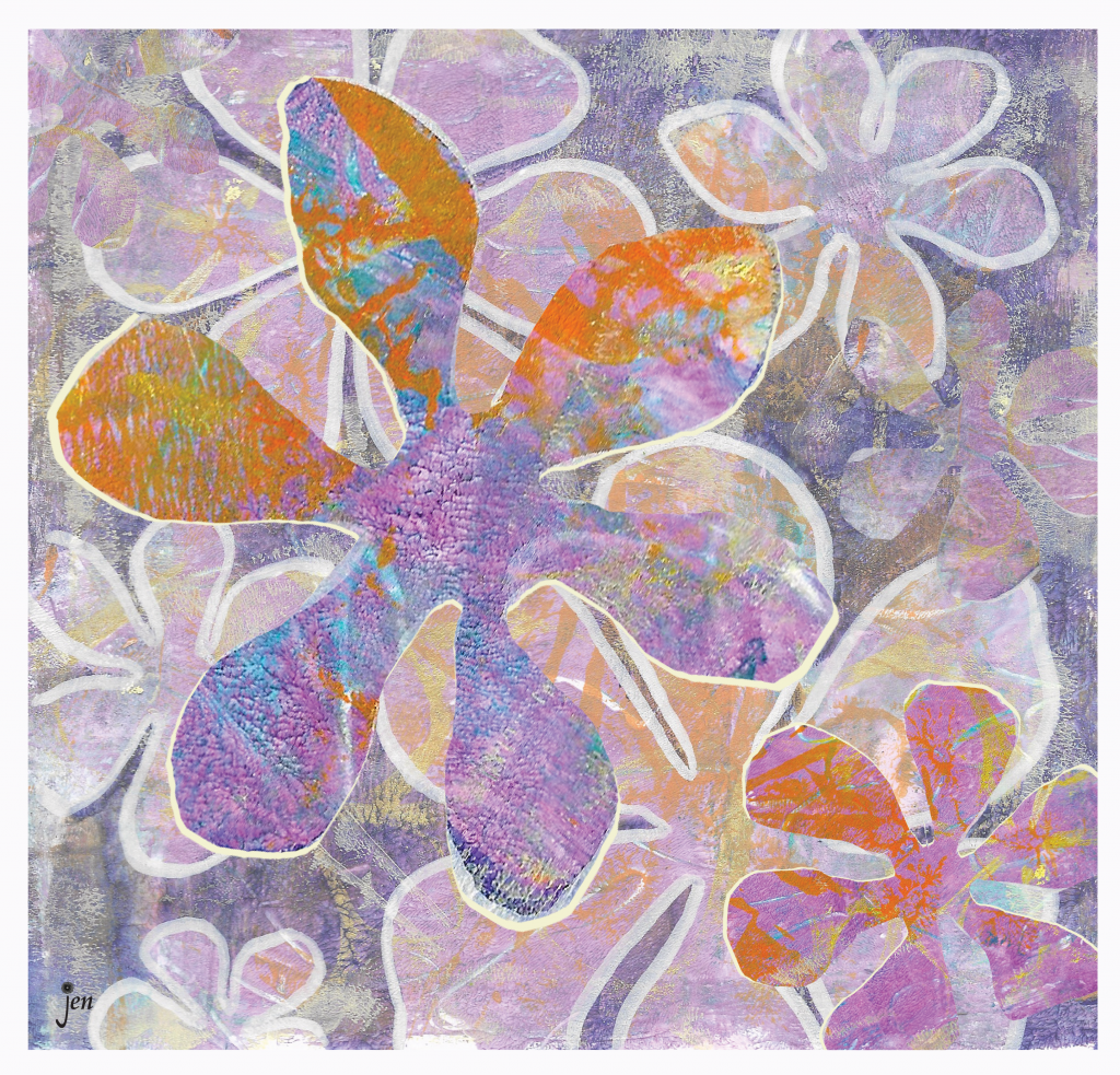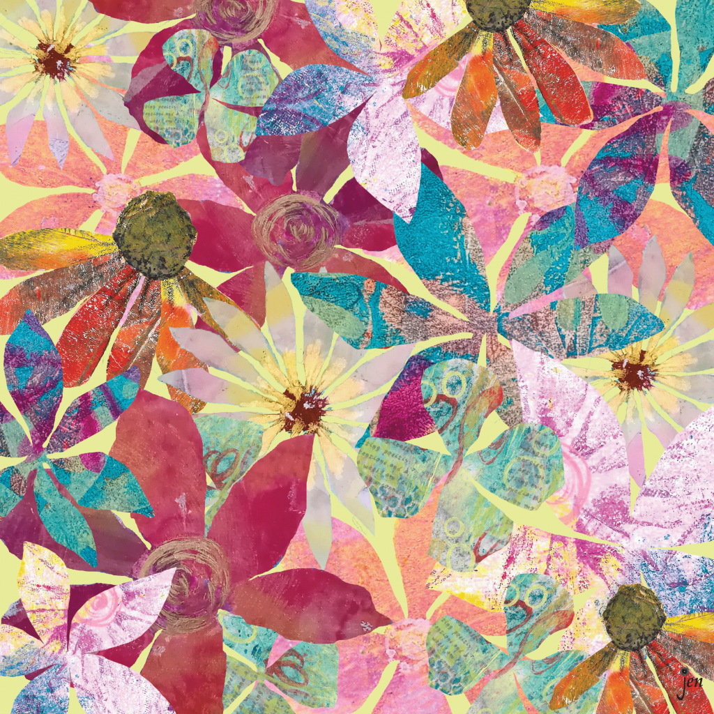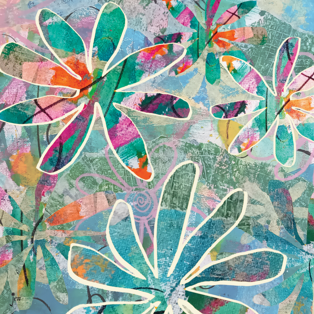 Bloom Explosion – created by adapting some of my original acrylic paint, mixed media and collage journal pieces using Photoshop and Illustrator; just added to my greeting card range available to purchase via: https://mademe.co.uk/shop/jen-art/